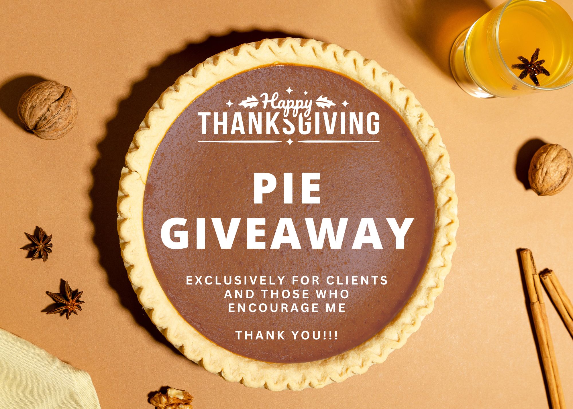So, according to tradition, we would LOVE to give you a delicious, large, THANKSGIVING PIE made by “Mrs. Costco” (best pies ever!) as an expression of our appreciation for you.